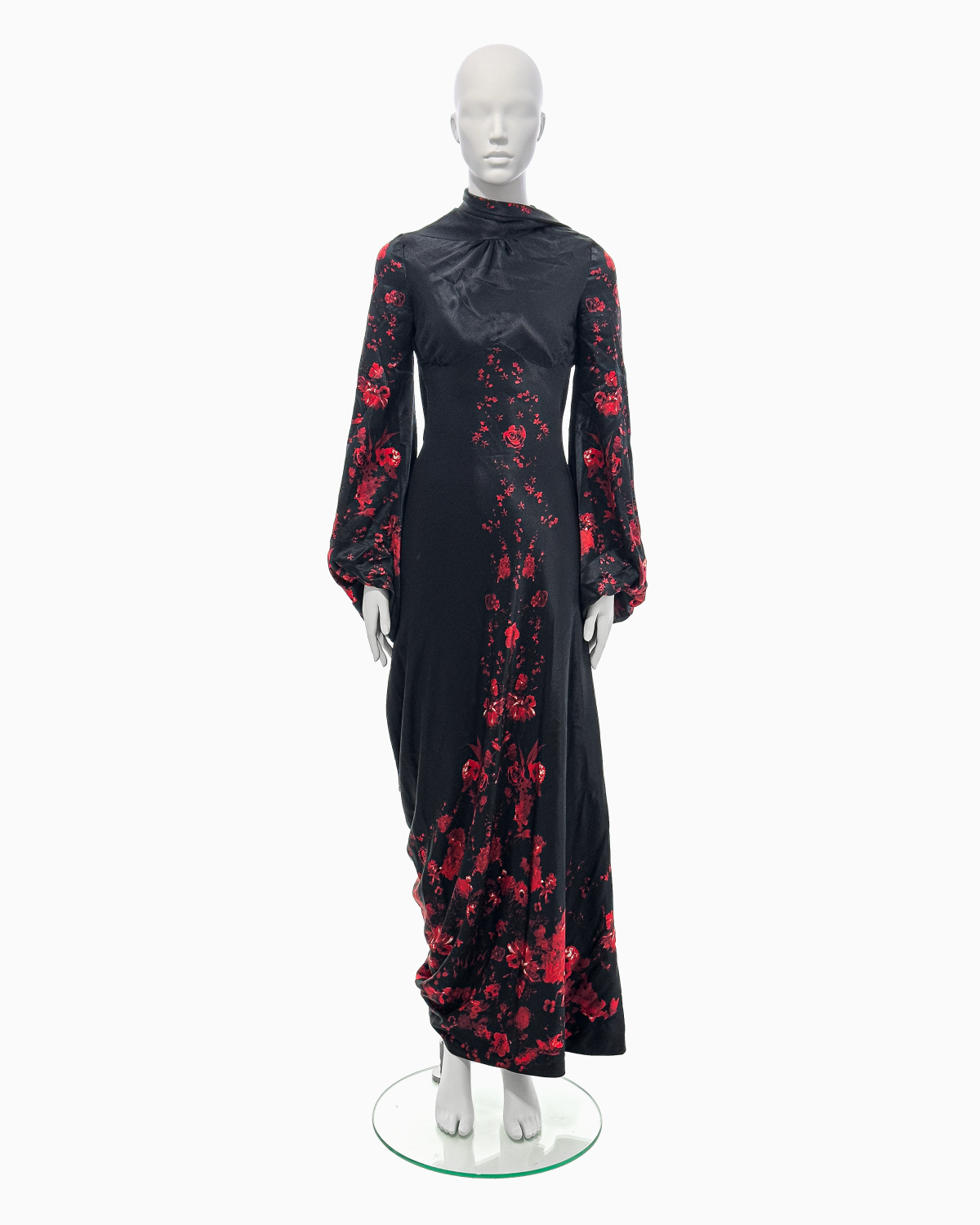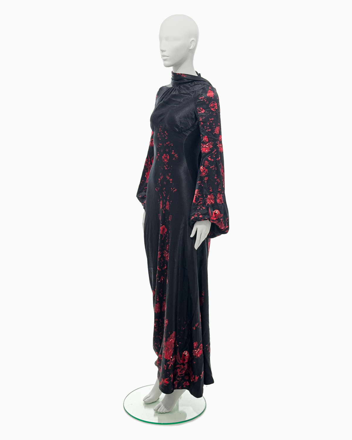 An exceptionally rare Alexander McQueen black silk kimono gown from the Fall/Winter 2009 collection, featuring a fitted bodice with draped neckline, long blouson sleeves, and a floor-length skirt with cascading back panel, printed throughout with red roses motifs.
